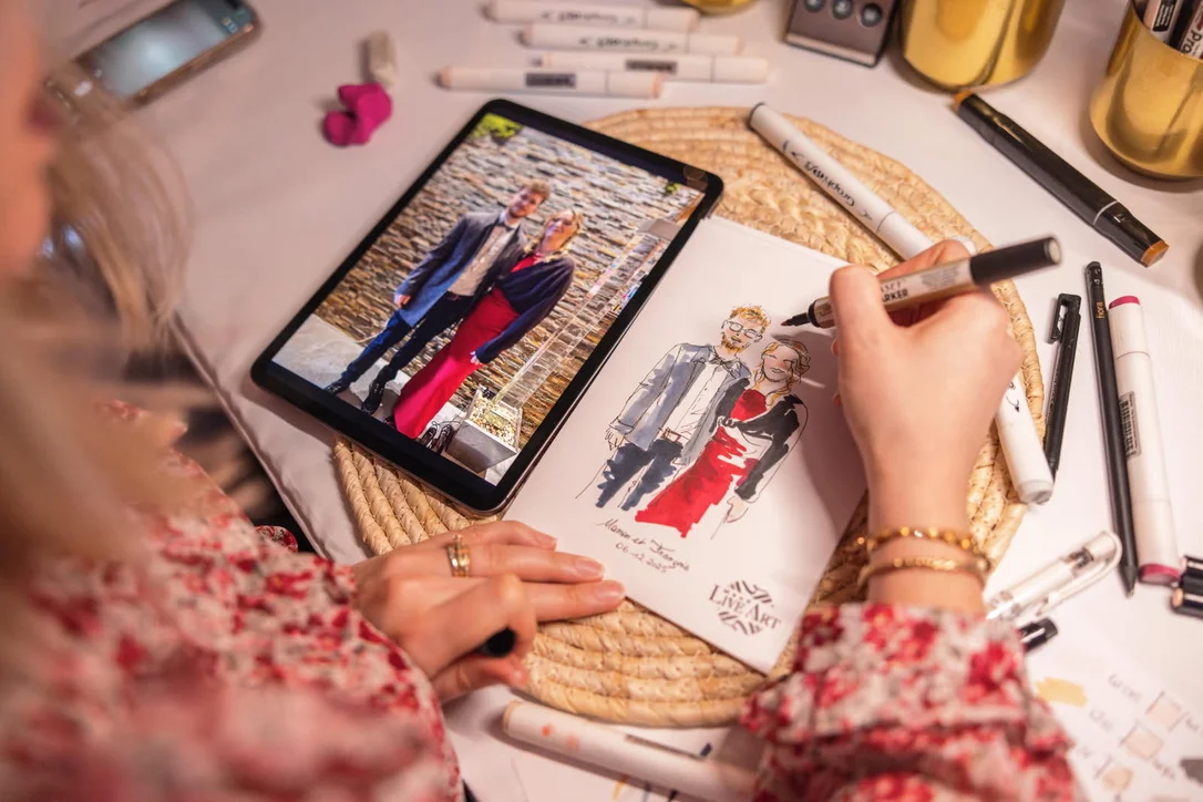 Je réalise également des Live Painting : Portraits d’invités & Le Portrait des Mariés, lors de Mariage! Des Baby-Shower, des EVJF… Chaque moments de vie est l'occasion de raconter votre histoire, au travers du dessin. Avec authenticité, raffinement et un soin particulier apporté à chaque détail.