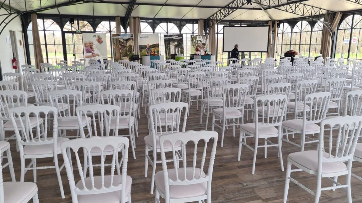 Vue dégagée sur 15 hectares, terrasse accessible à tous, et intérieurs pensés pour le confort. Côté logistique, vous gagnez du temps : un office traiteur de 50 m² avec chambre froide, une salle de détente avec télévision et canapés, et un parking sécurisé pour 150 véhicules et cars. Résultat : un lieu de réception en pleine nature, pratique au quotidien, qui concilie inspiration et efficacité.