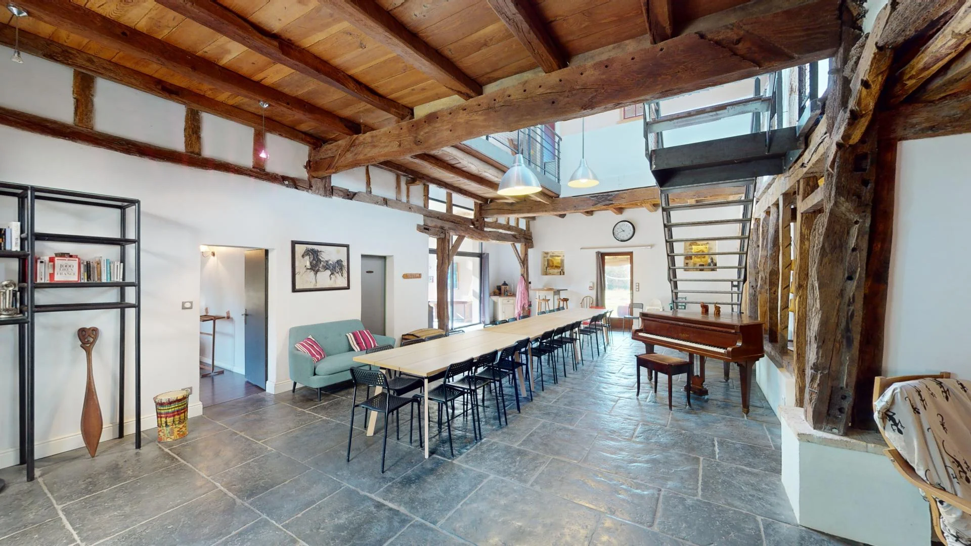 L’effet waouh commence au portail : un chemin privatif d’environ 180 m, des prairies, du bois, puis la bâtisse se dévoile. À l’intérieur, de beaux volumes baignés de lumière. À l’extérieur, des espaces arborés pour souffler entre deux ateliers ou trinquer au coucher du soleil. C’est un gîte de groupe nature, facile d’accès, pensé pour recevoir dans le calme et la bonne humeur. Le site s’adapte aux besoins, y compris pour des séminaires avec participants PMR, tout en offrant une technique fiable pour dérouler votre programme sans friction.