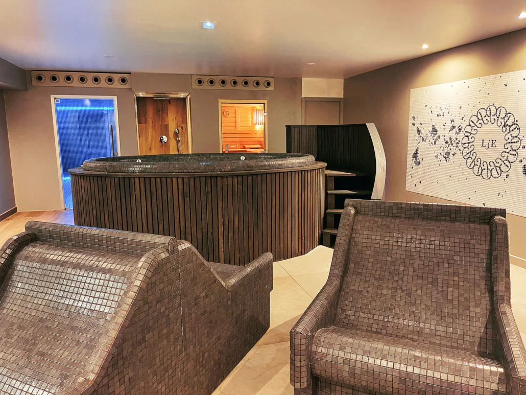 Le spa réunit hammam, sauna, jacuzzi et une cabine de soins dans une ambiance feutrée. Le parcours est intuitif, les transitions sont douces, l’esprit se pose. Les installations, modernes et impeccablement entretenues, créent un véritable cocon pour se détendre en solo, en duo ou après une journée bien remplie.