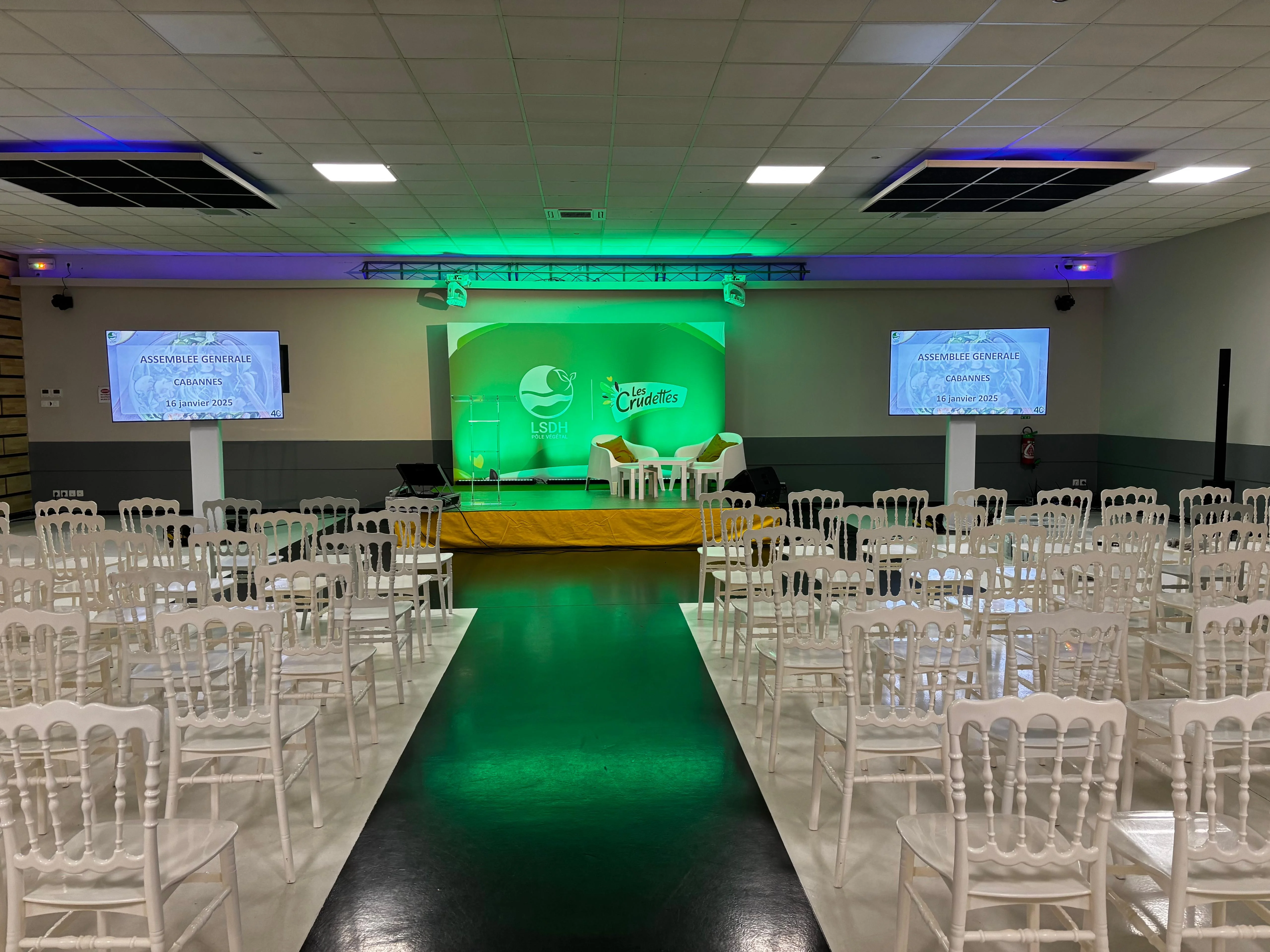 Nous dimensionnons la sonorisation et l'éclairage à partir de votre programme : temps de parole, séquences vidéo, interventions micro, animation de soirée, contraintes du lieu. Selon le format, nous mettons en place des micros filaires ou HF, une diffusion façade, des retours si nécessaire, puis un éclairage scénique ou architectural pour structurer l'espace et la visibilité.